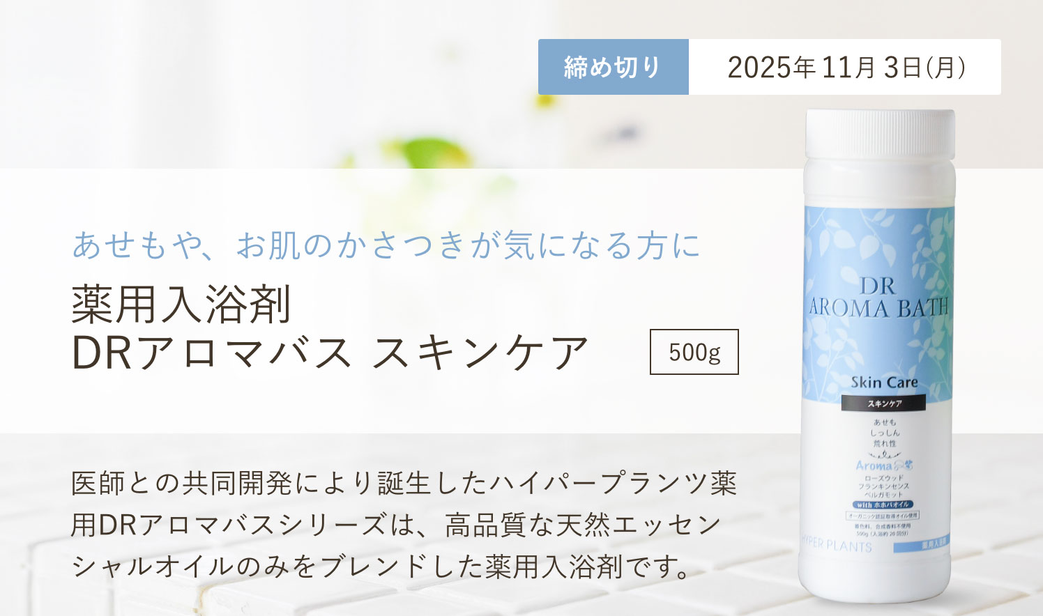 「薬用入浴剤 DRアロマバス スキンケア 500g」をご注文のお客様は、2025年11月3日まで送料無料! ご注文はこちらから